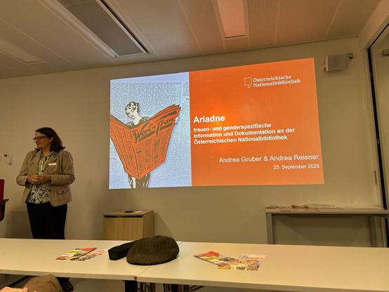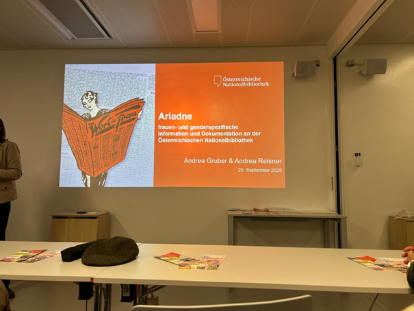 25.09.2025 tarihinde sat 09.30’da “Archive: Gedächtnisspeicher von Kultur und Literatur: Frauen – Frieden – Sicherheit” adlı seminer ekibi Avusturya Ulusal Kütüphanesi’nin Kadına ve Cinsiyete Özgü Bilimsel Portalı  “Ariadne”yi ziyaret etti. Andreas Gruber  ve Andrea Reisner Bilgi ve Medya Merkezi’nde sunumlarını gerçekleştirdiler. Bütün katılımcılarla birlikte Michl lokantasında yenilen yemeklerden sonra Cornelia Sijaric’in sunumu ile Kadın, Bilim ve Gelişme Bakanlığı’na gidildi.