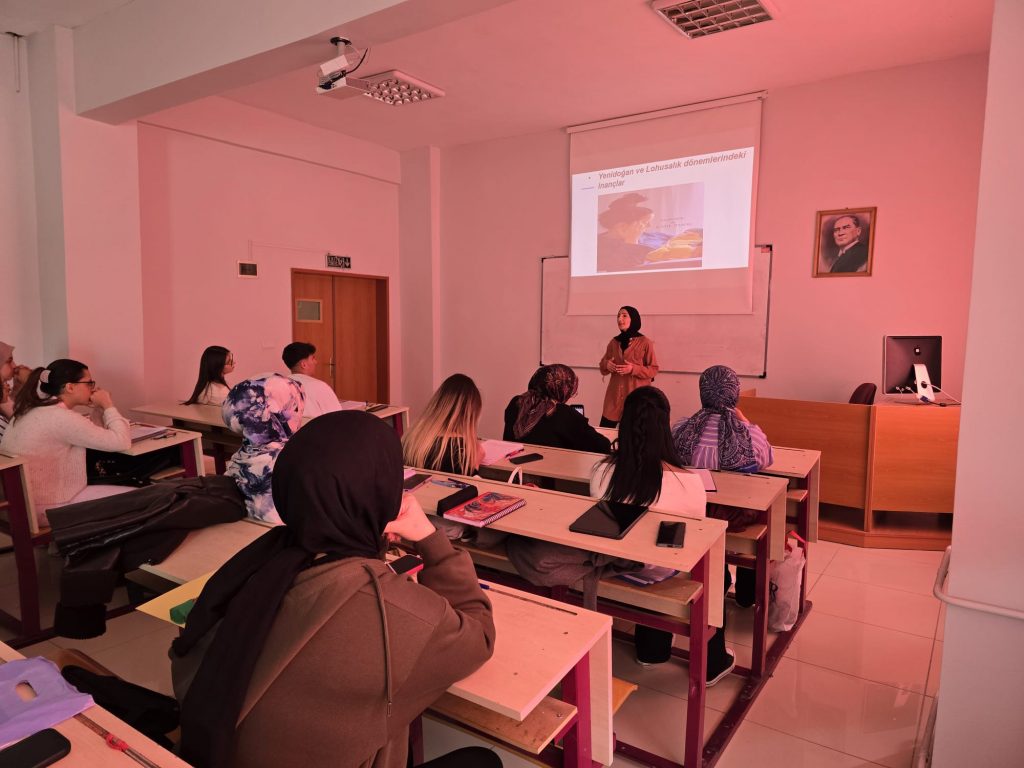TDP kapsamında çocuk gelişimi 1. sınıf öğrencisi Beyza YILDIZ tarafından kendi programındaki öğrencilere “Yenidoğan ve Lohusalık dönemindeki inanışlar” konulu bilgilendirme sunumu yapıldı.