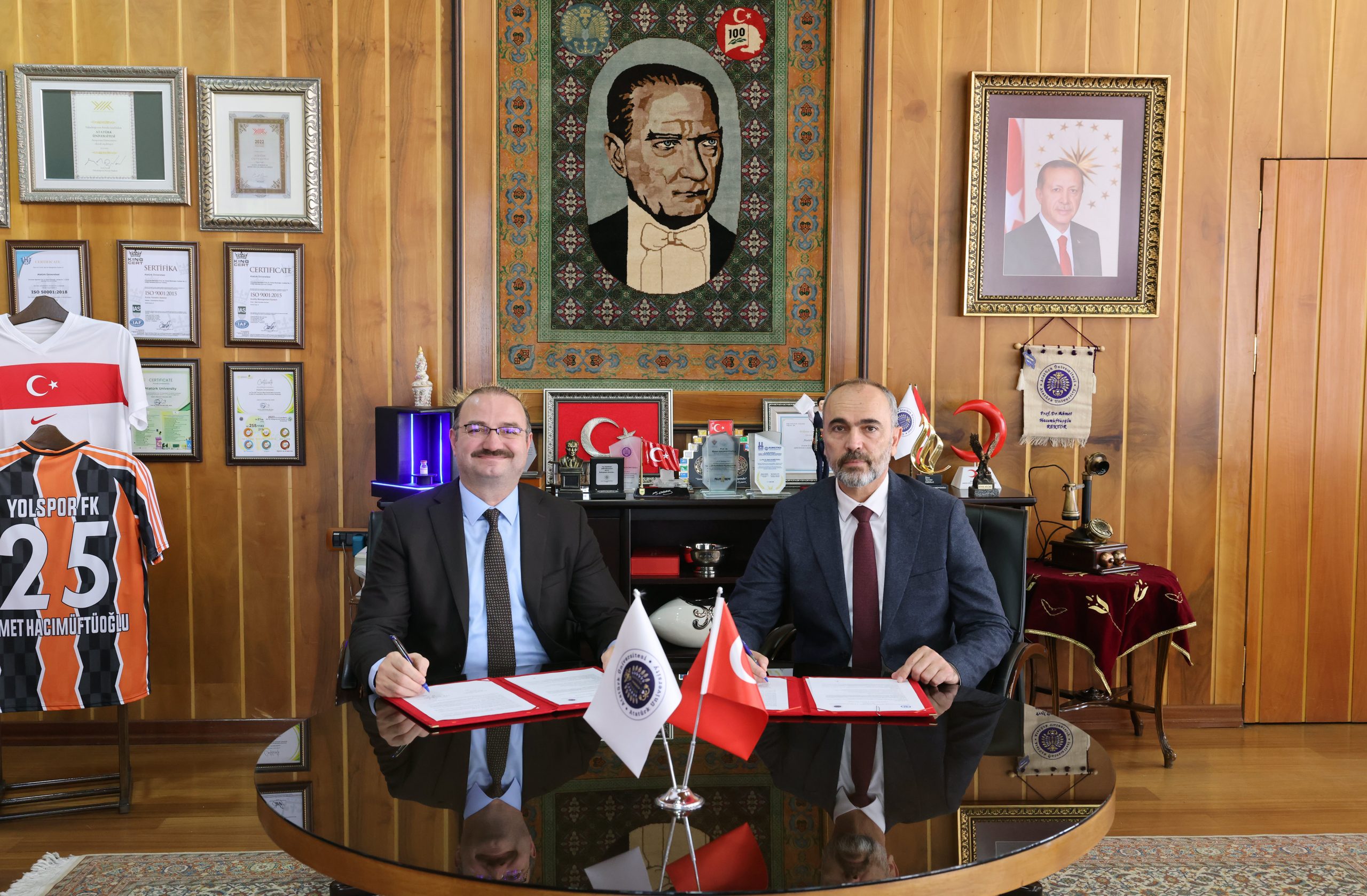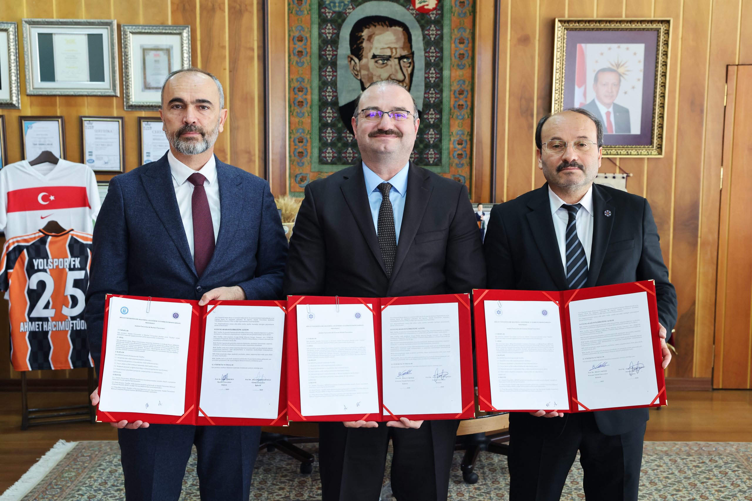 Atatürk Üniversitesi Rektörü Prof. Dr. Ahmet Hacımüftüoğlu’nun ev sahipliğinde; Erzurum Teknik Üniversitesi Rektörü Prof. Dr. Bülent Çakmak ile Bayburt Üniversitesi Rektörü Prof. Dr. Mutlu Türkmen’in katılımıyla imzalanan bu stratejik protokol; araştırma kapasitesinin güçlendirilmesi, akademik iş birliklerinin artırılması, ortak projelerin teşvik edilmesi ve bilimsel çıktıların ulusal ve uluslararası düzeyde görünürlüğünün artırılmasını hedefliyor.