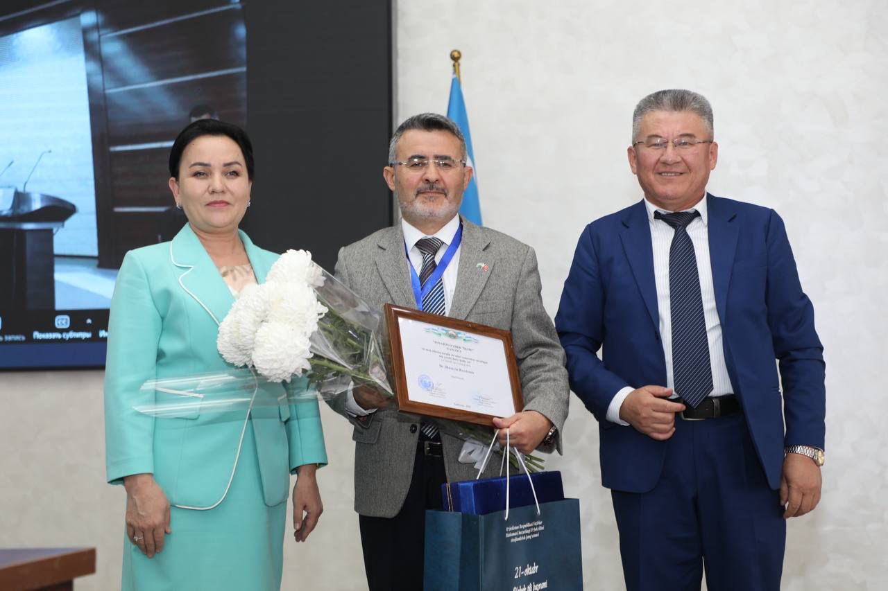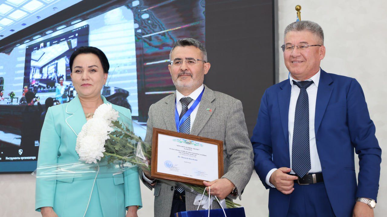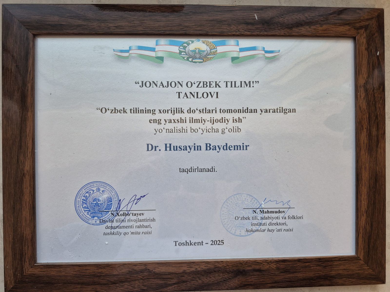 Bölümümüz öğretim üyesi Prof. Dr. Hüseyin Baydemir’e Özbekistan’da ödül verildi. Özbekistan Cumhuriyeti Bakanlar Kuruluna bağlı olarak faaliyet yürüten “Davlat tilini rivojlantirish departmenti (Devlet Dilini Geliştirme Bölümü) Başkanlığı tarafından her yıl 21 Ekim Özbek Dili Bayramı vesilesiyle Özbekçeye hizmet edenlere ödül verilmektedir. Bu yıl ilk kez, ayrı bir kategoride, Özbekistan’ın dışında, yabancı araştırmacılar içinde Özbekçeye hizmet edenlere ödül verilmesi kararlaştırılmış olup, Bölümümüz öğretim üyesi Prof. Dr. Hüseyin Baydemir’e birincilik ödülü verilmiştir. Ödül töreni 16 Ekim 2025 Perşembe günü Özbekistan’ın başkenti Taşkent’te yapılmıştır. Prof. Dr. Hüseyin Baydemir aynı tarihlerde Özbekistan’ın Kaşkaderya Eyaletinde önceden planlanmış başka faaliyetlere katıldığı için Taşkent’teki ödül törenine iştirak edememiştir. Baydemir’e ödülü 21 Ekim 2025 Salı günü Karşi şehrinde düzenlenen özel bir törenle Kaşkaderya Eyalet Vali Yardımcısı ve Kaşkaderya Eyalet Vali Başdanışmanı tarafından tevdi edilmiştir. Burada kısa bir teşekkür konuşması yapan Baydemir, törene katılan herkesin ve Özbek halkının -Özbekçeye Devlet Dili Makamı verilişinin 36. yıldönümü vesilesiyle kutlanmakta olan- Özbek Dili Bayramını tebrik etti ve kendisine layık görülen ödülden dolayı duyduğu mutluluğu dile getirdi. Dr. Nursan Ildırı ile birlikte hazırladıkları ve 2025 yılında TDK Yayınları arasında neşredilen Büyük Özbekçe-Türkçe Sözlük’ü Dil Bayramı vesilesiyle Özbek halkına armağan etti.