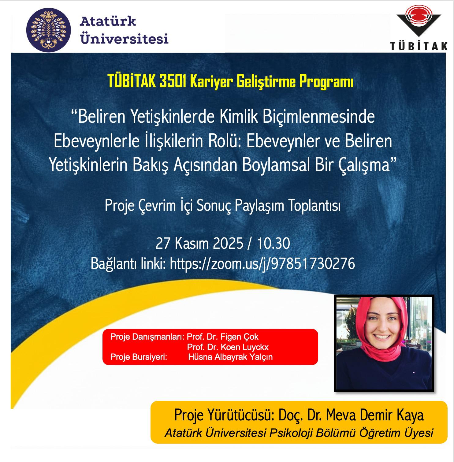 27 Kasım 2025 tarihinde saat 10.30’da düzenlenen toplantıda, “Beliren Yetişkinlerde Kimlik Biçimlenmesinde Ebeveynlerle İlişkilerin Rolü: Ebeveynler ve Beliren Yetişkinlerin Bakış Açısından Boylamsal Bir Çalışma” başlıklı projenin bulguları ve çıktıları katılımcılarla paylaşıldı. Projenin danışmanlığını Prof. Dr. Figen Çok ve Prof. Dr. Koen Luyckx üstlenirken, proje bursiyeri olarak Hüsna Albayrak Yalçın görev aldı.