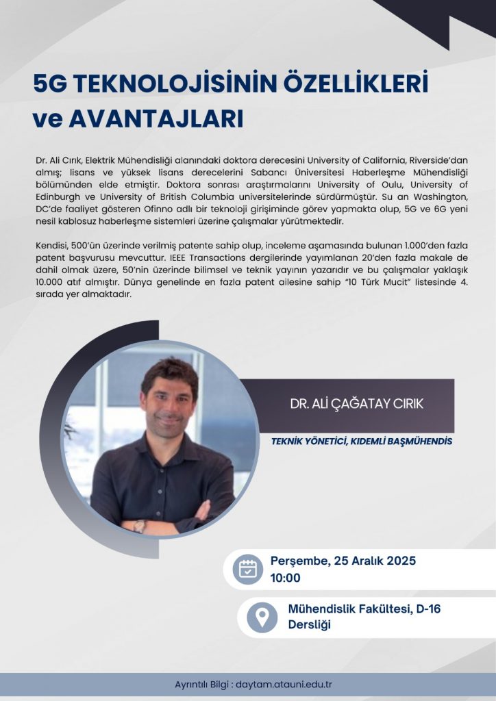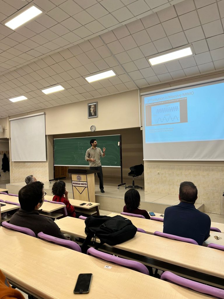 Seminer, 5G ve 6G kablosuz haberleşme sistemleri alanında uluslararası düzeyde çalışmaları bulunan Dr. Ali Çağatay Cırık tarafından verildi. Etkinlik kapsamında 5G teknolojisinin temel bileşenleri, sağladığı teknik avantajlar, mevcut haberleşme altyapılarıyla farkları ve gelecekteki uygulama alanları ele alındı. Ayrıca yeni nesil kablosuz haberleşme sistemlerinin endüstri, akademi ve günlük yaşam üzerindeki etkilerine ilişkin güncel örnekler paylaşıldı.