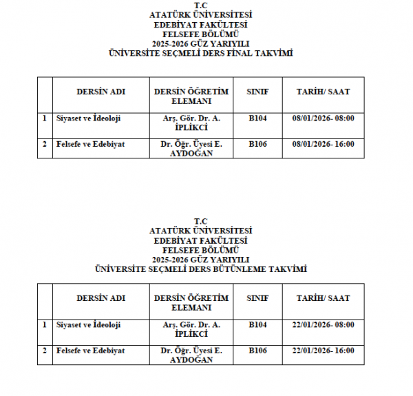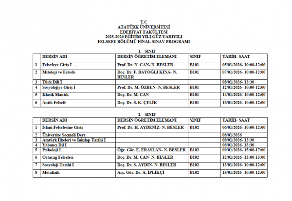 19 Aralık 2025 FELSEFE BÖLÜMÜ 2025-2026 GÜZ YARIYILI ÜNİVERSİTE SEÇMELİ DERS FİNAL VE BÜTÜNLEME TAKVİMİ