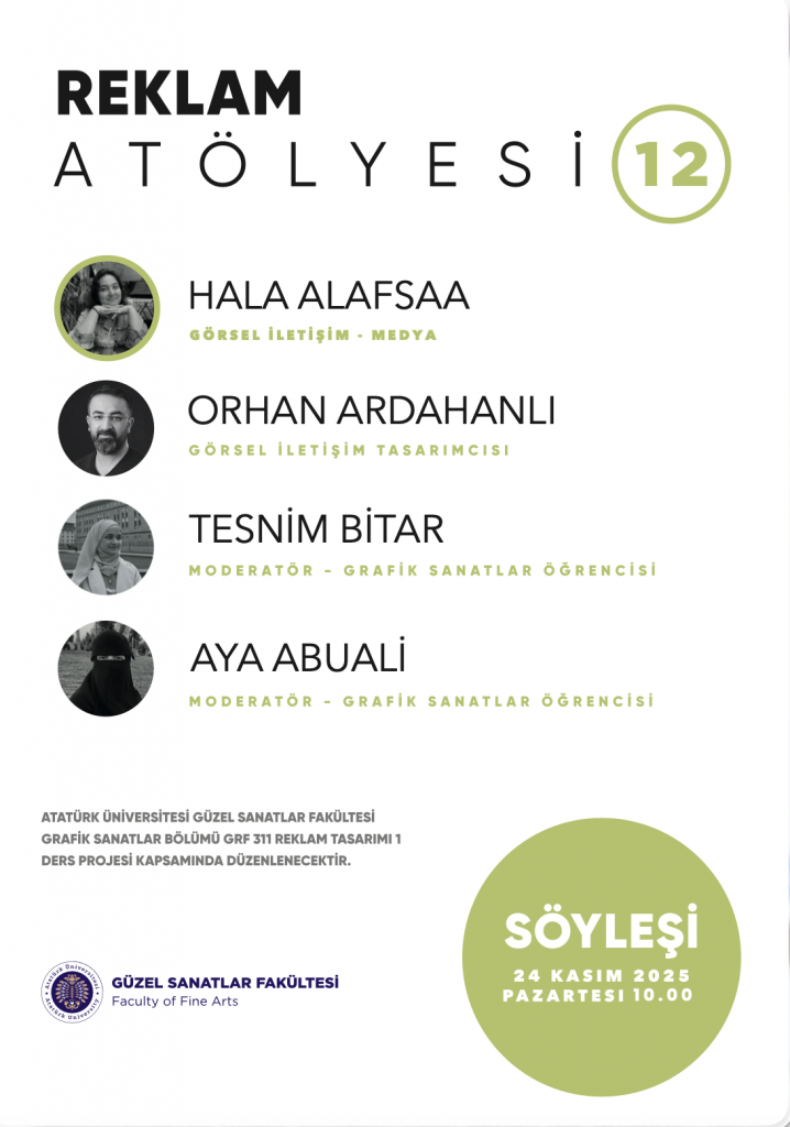 Atatürk Üniversitesi Güzel Sanatlar Fakültesi Grafik Sanatlar Bölümü tarafından düzenlenen Reklam Atölyesi 12, 24 Kasım 2025 Pazartesi günü saat 10.00’da gerçekleştirildi. Etkinlik, Öğr. Gör. Orhan Ardahanlı tarafından yürütülen GRF 311 / Reklam Tasarımı I dersi kapsamında hazırlandı.