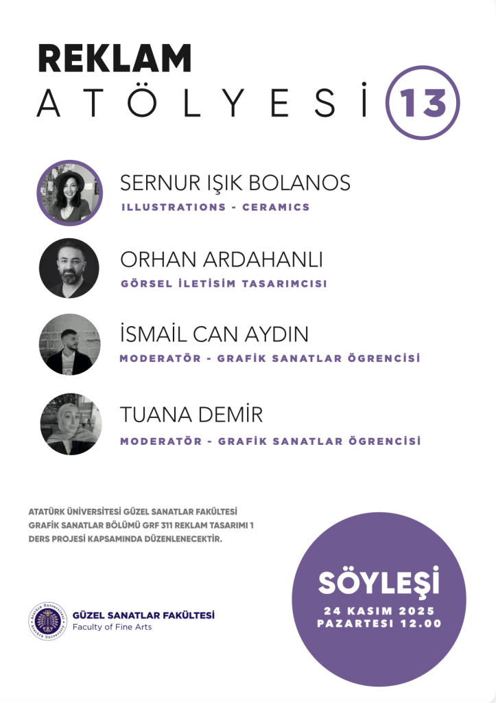 Aynı gün saat 12.00’de gerçekleştirilen Reklam Atölyesi 13, illüstrasyon ve seramik disiplinlerini bir araya getiren özgün bir üretim pratiğine sahip Sernur Işık Bolanos’u ağırladı. Etkinlik, Öğr. Gör. Orhan Ardahanlı koordinasyonunda yine GRF 311 / Reklam Tasarımı I dersi kapsamında düzenlendi.