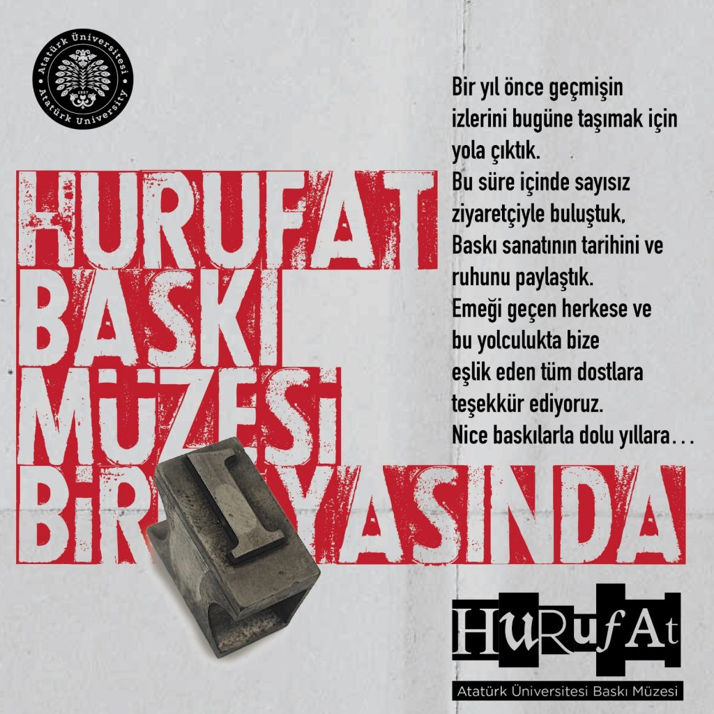 17 Ekim 2024 tarihinde kapılarını ziyaretçilerine açan Atatürk Üniversitesi Hurufat Baskı Müzesi, geleneksel matbaa kültürünü yaşatmak, geçmişin izlerini bugüne taşımak amacıyla kuruldu. Bugün, bu özel yolculuğun ilk yılını geride bırakmanın mutluluğunu yaşıyoruz.