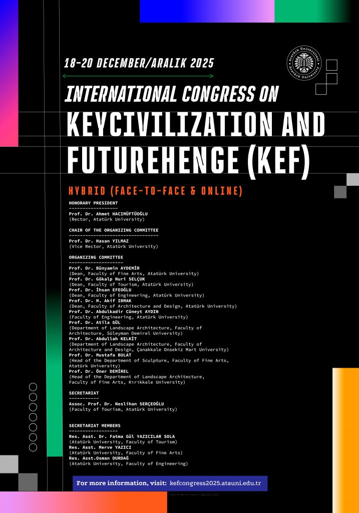 Atatürk Üniversitesi ev sahipliğinde 18–20 Aralık 2025 tarihleri arasında hibrit (yüz yüze ve çevrim içi) olarak gerçekleştirilecek International Congress on Keycivilization & Futurehence (KEF 2025)’in düzenleme komitesinde fakültemizden akademisyenler yer almaktadır.