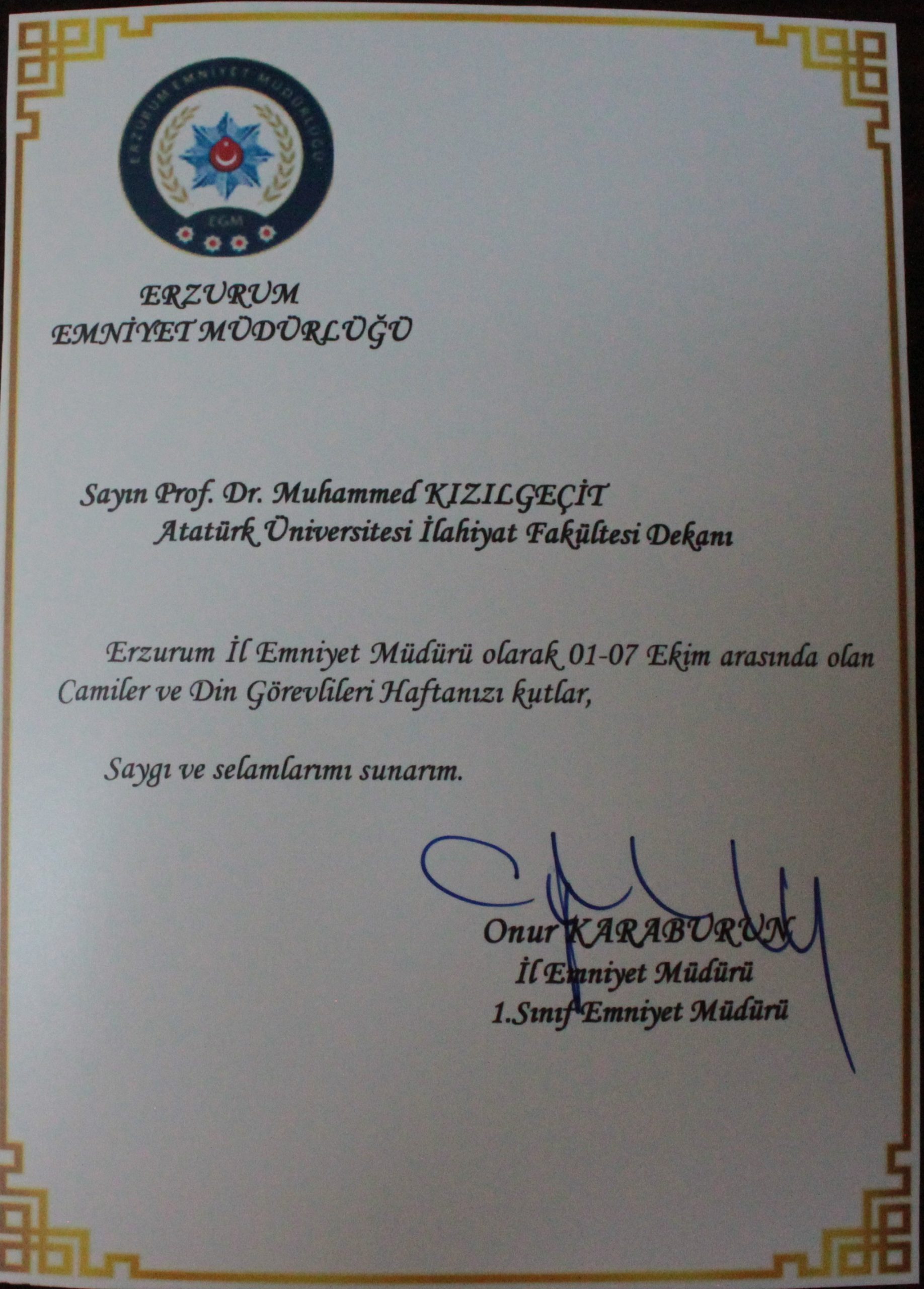 01-07 Ekim Camiler ve Din Görevlileri Haftası münasebetiyle Erzurum İl Emniyet Müdürlüğü yetkililerinden İl Emniyet Müdür Yardımcısı ve beraberindeki heyet, Fakültemiz Dekanı Prof. Dr. Muhammed Kızılgeçit’i makamında ziyaret etti. Ziyarette, haftanın anlam ve önemine vurgu yapılarak Camiler ve Din Görevlileri Haftası tebrik edildi.