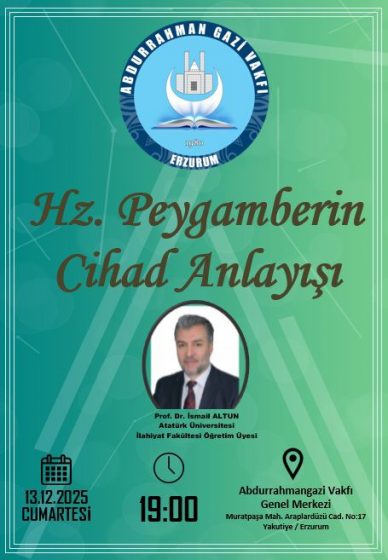 17 Aralık 2025 Prof. Dr. İsmail ALTUN – Hz. Peygamber’in Cihad Anlayışı Fakültemiz öğretim üyesi Prof Dr. İsmail Altun, 13 Aralık 2025 tarihinde Erzurum Abdurrahman Gazi Vakfı Genel Merkezinde “Hz. Peygamberin Cihad Anlayışı” temalı bir sunum gerçekleştirdi.