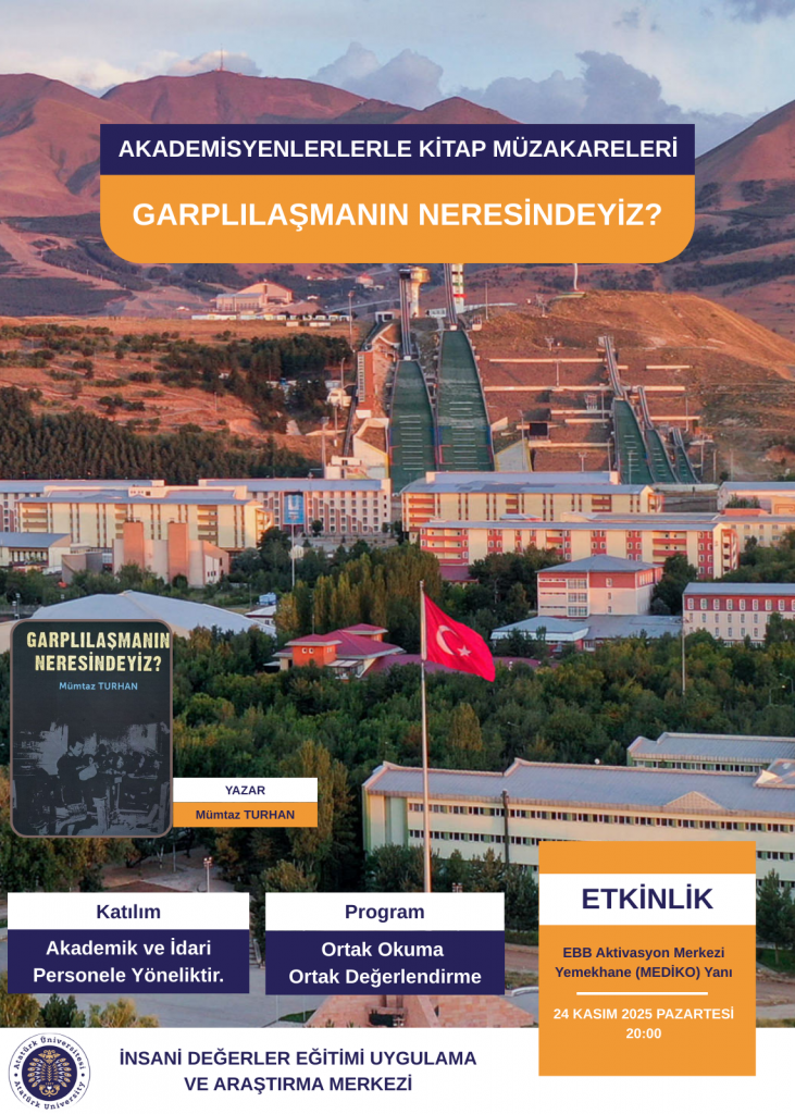 24 Kasım 2025 tarihinde İnsani Değerler Eğitimi Uygulama ve Araştırma Merkezi tarafından düzenlenen etkinlikte, Mümtaz Turhan’ın “Garplılaşmanın Neresindeyiz?” adlı eseri akademik ve idari personelin katılımıyla derinlemesine analiz edilmiştir. Müzakere süresince, Batılılaşmanın teknik bir transferden ziyade köklü bir zihniyet ve eğitim dönüşümü gerektirdiği vurgulanmış; taklitçi modernleşme yerine bilimsel ve özgün kalkınma modellerinin önemi üzerinde durulmuştur. Farklı disiplinlerden gelen katılımcıların katkılarıyla zenginleşen oturumda, Turhan’ın düşüncelerinin günümüz Türkiye’sinin toplumsal ve kurumsal sorunlarını anlamada hâlâ kritik bir rehber olduğu ve bu tür entelektüel buluşmaların üniversite bünyesindeki ortak düşünme kültürünü güçlendirdiği sonucuna varılmıştır.