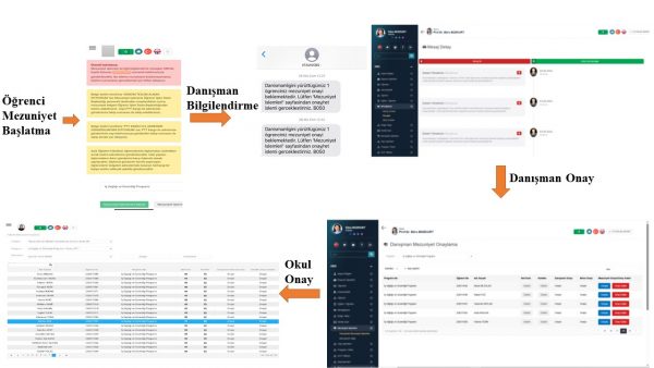• Ardından sırasıyla Okul Müdürlüğü ve Öğrenci İşleri Daire Başkanlığı (ÖİDB) tarafından dijital ortamda onaylar verildikten sonra öğrenci mezuniyet işlemini tamamlamış olmaktadır.