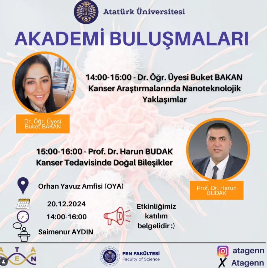 Akademi Buluşması: Bölümümüz öğretim üyelerinden Prof. Dr. Harun BUDAK ve Dr. Öğr. Üyesi Buket BAKAN tarafından verilen “Kanser calışmalarında nanoteknoloji ve bitkisel tedaviler” konulu seminerden bazı kareler.