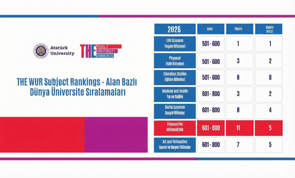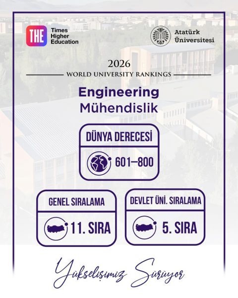Atatürk Üniversitesi Mühendislik Fakültesi, Times Higher Education (THE) 2026 Alan Bazlı Dünya Üniversiteleri Sıralamalarında, mühendislik alanında 601–800 dünya bandında yer alarak uluslararası akademik alandaki güçlü konumunu bir kez daha teyit etmiştir.