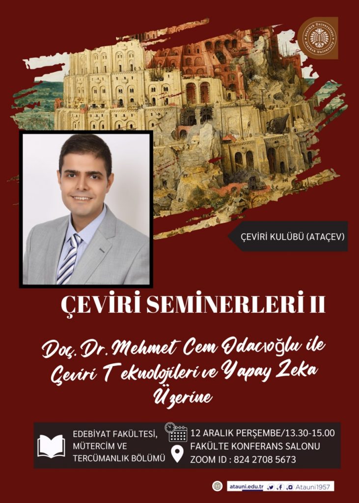 AAtatürk Üniversitesi İngilizce Mütercim ve Tercümanlık Bölümü olarak, Bölümümüz Çeviri Kulübü (ATAÇEV) tarafından düzenlenen “Çeviri Seminerleri” serimizin bu dönemki ikinci etkinliğini duyurmaktan mutluluk duyarız.