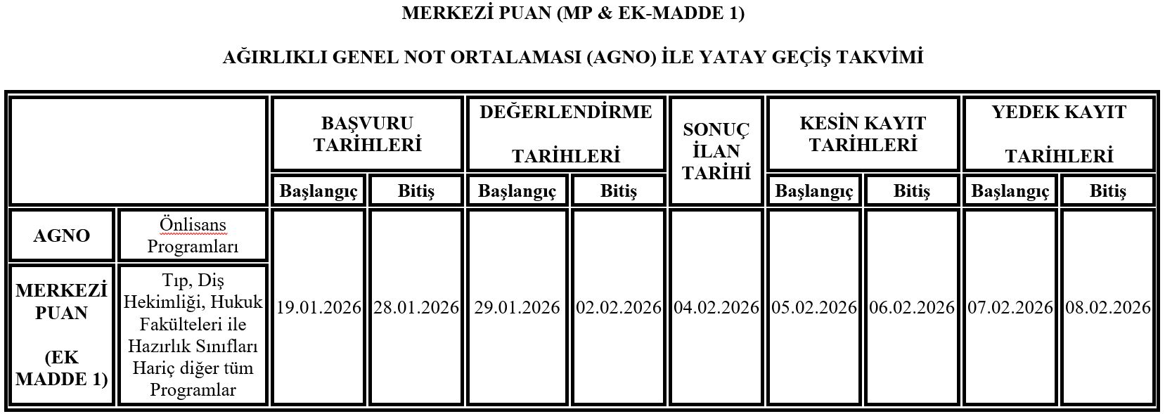 AGNO ile yatay geçiş için kontenjanlar ve diğer bilgilere Yükseköğretim Kurulu Başkanlığı’nın YATAY GEÇİŞ İŞLEMLERİ sayfasından ulaşılabilmektedir. | Merkezi Puan (EK MADDE-1) ile yapılacak yatay geçişler için Üniversite Senatosunun 10.12.2025 tarihli kararıyla; “Üniversitemizde eğitim-öğretim faaliyetlerini yıllık olarak yürüten hazırlık sınıfları ile Diş Hekimliği Fakültesi, Hukuk Fakültesi ve Tıp Fakültesi Programları hariç olmak üzere diğer tüm birimlerinde yürütülmekte olan önlisans ve lisans programlarının her bir sınıfı için ilgili yılın Öğrenci Seçme ve Yerleştirme Sistemi Kılavuzunda öngörülen öğrenci kontenjanının %30’u kadar kontenjan ayrılması,“na karar verilmiştir. |