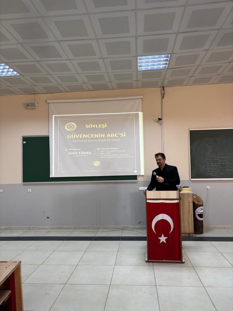 Sigorta bilincini artırmak ve sektörel farkındalık oluşturmak amacıyla gerçekleştirilen söyleşiye; Sigorta Uzmanı Sayın Ümit TÜDEŞ konuşmacı olarak katıldı. 17 Aralık 2025 Çarşamba günü düzenlenen etkinliğe, Yüksekokul Müdürümüz Sayın Melih OKCU, akademik ve idari personelimiz ile çok sayıda öğrencimiz katılım sağladı.