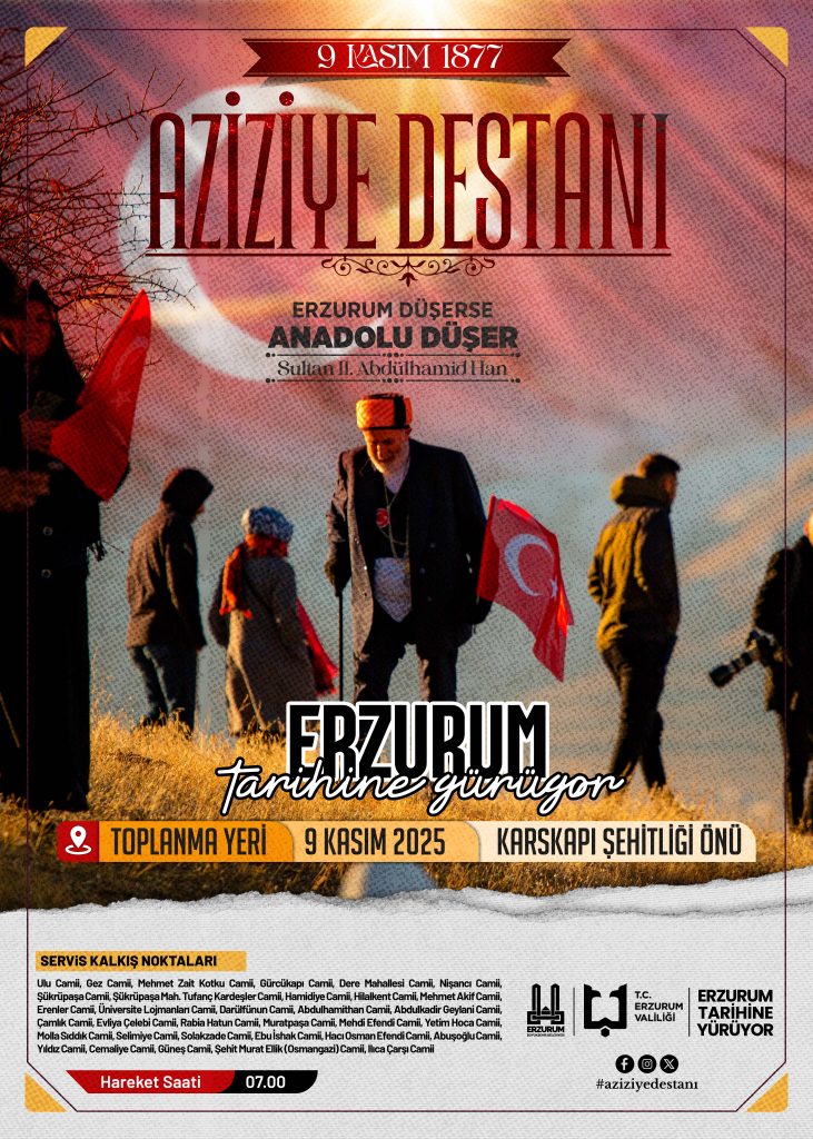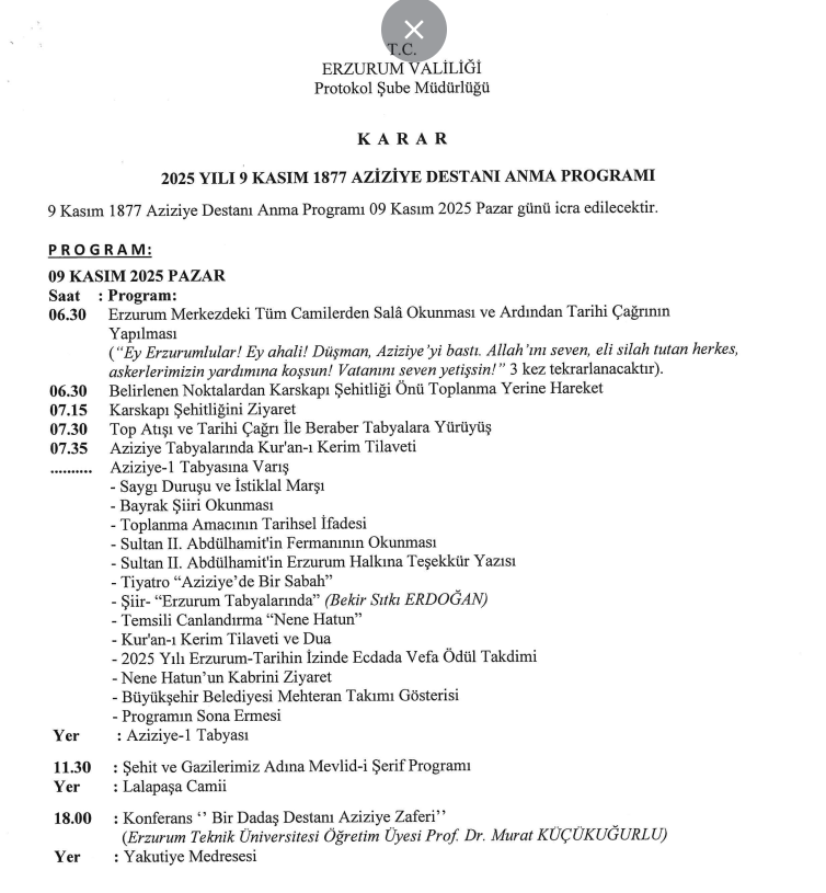 9 Kasım 1877 Aziziye Destanı Anma Programı nedeniyle 09 Kasım 2025 Pazar günü “Tabyalara