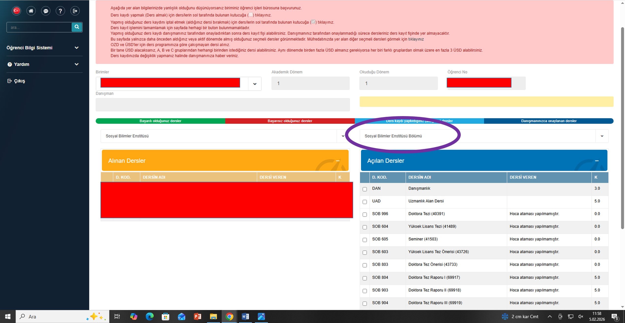 Ders dönemini tamamlayan lisansüstü öğrenciler Tez Önerisi, Seminer Doktora Tez Raporu vb. dersleri seçebilmeleri için sayfanın sağ üst tarafında yer alan sekmeyi Sosyal Bilimler Enstitüsü seçerek bu derslere ulaşabilirler. (aşağıdaki görsele bakabilirsiniz)