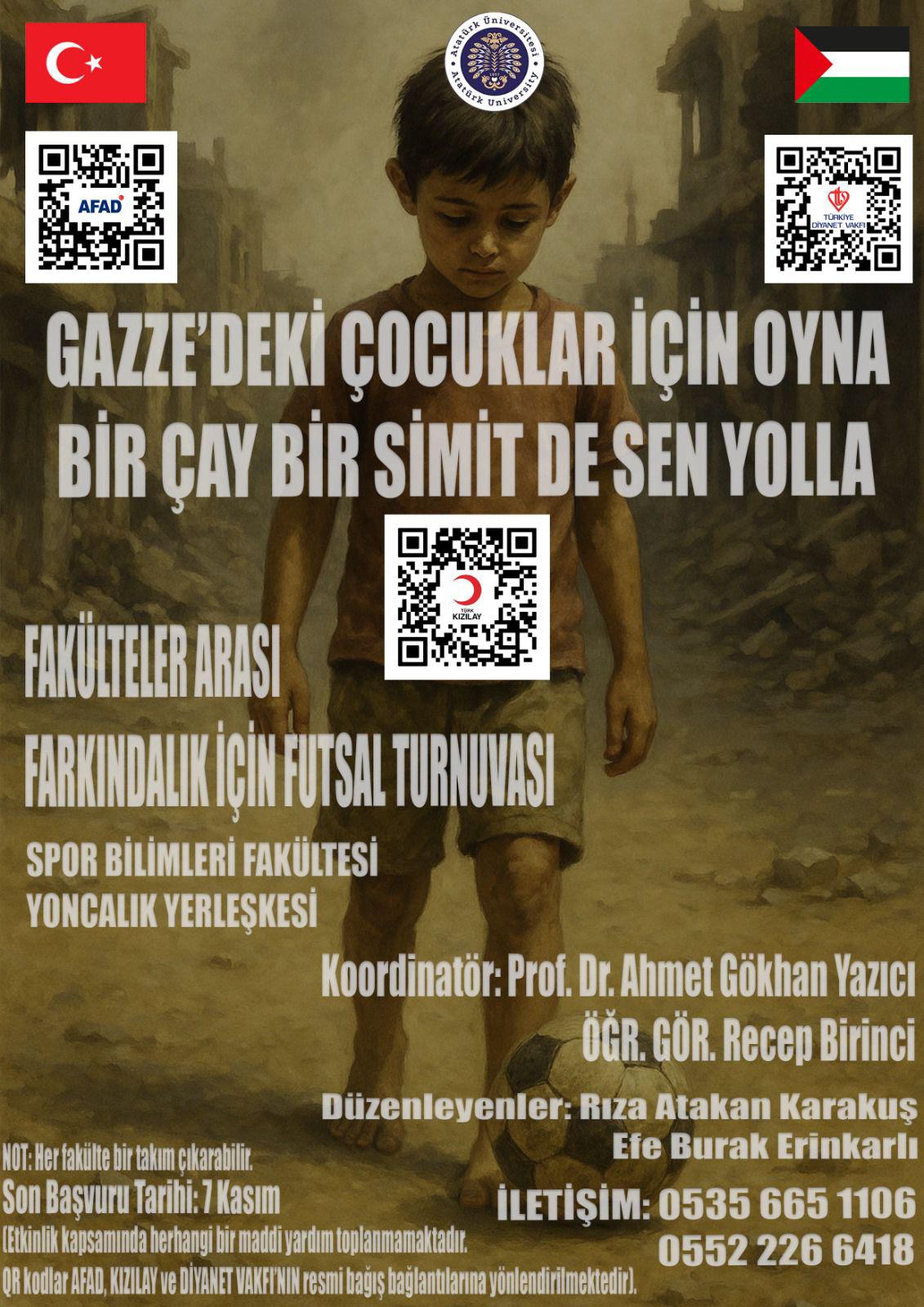 Atatürk Üniversitesi Spor Bilimleri Fakültesi öncülüğünde, fakülteler arası katılımla “Gazze’deki Çocuklar İçin Oyna – Bir Çay Bir Simit de Sen Yolla” temalı farkındalık futsal turnuvası düzenlenecektir.