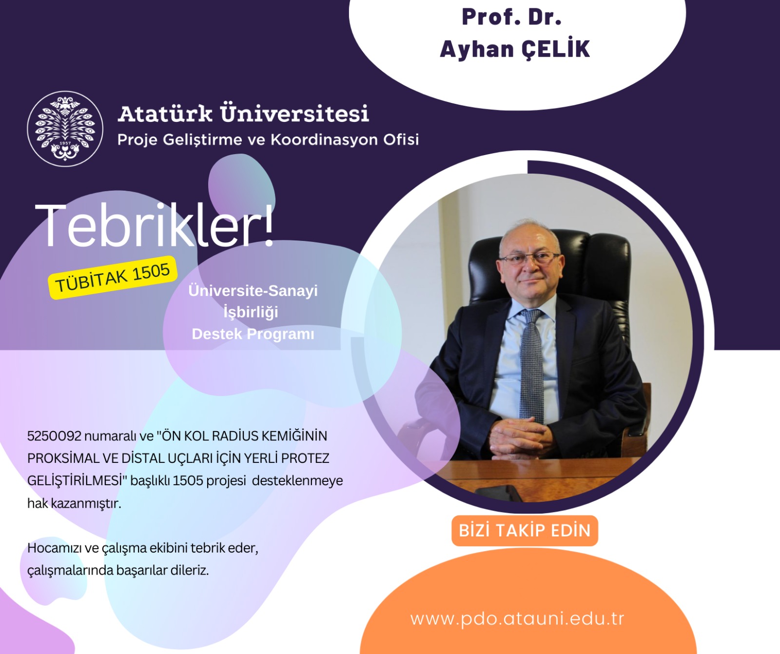 Atatürk Üniversitesi, üniversite-sanayi iş birliğini güçlendiren nitelikli bir projeye daha imza attı. Prof. Dr. Ayhan Çelik yürütücülüğünde hazırlanan ve “Ön Kol Radius Kemiğinin Proksimal ve Distal Uçları İçin Yerli Protez Geliştirilmesi” başlığını taşıyan 52500092 numaralı proje, TÜBİTAK 1505 – Üniversite-Sanayi İşbirliği Destek Programı kapsamında desteklenmeye hak kazandı.